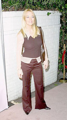 Jeri Ryan in the purple dress with the rectangle shaped necklace on the 2002 Absolut Party at the Chateau Marmont Hotel dated 17 October 2002.
